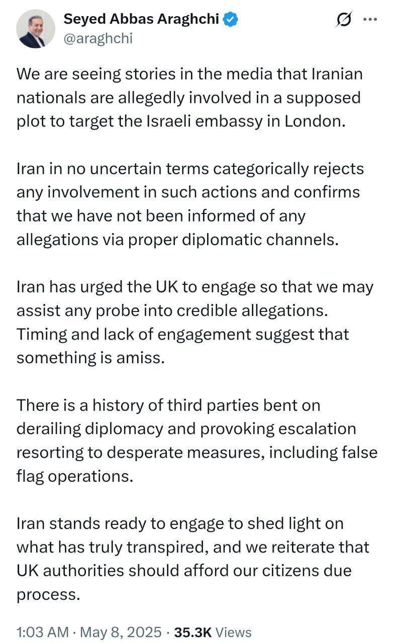 عراقچی ادامه داد: ما از طریق مجاری دیپلماتیک مربوطه از چنین اتهاماتی مطلع نشدهایم. ایران از بریتانیا خواسته است که وارد تعامل شود تا ما قادر باشیم به هر گونه تحقیق درباره اتهامات معتبر کمک کنیم.