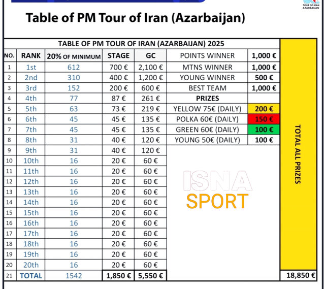 جدول جوایز تور ایران – آذربایجان به شرح زیر است: