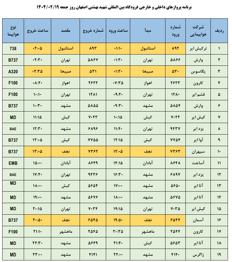 به گزارش نبض وطن، اطلاعات پروازهای داخلی و خارجی فرودگاه بینالمللی شهید بهشتی اصفهان امروز _جمعه نوزدهم اردیبهشت ماه_ به شرح زیر است:
