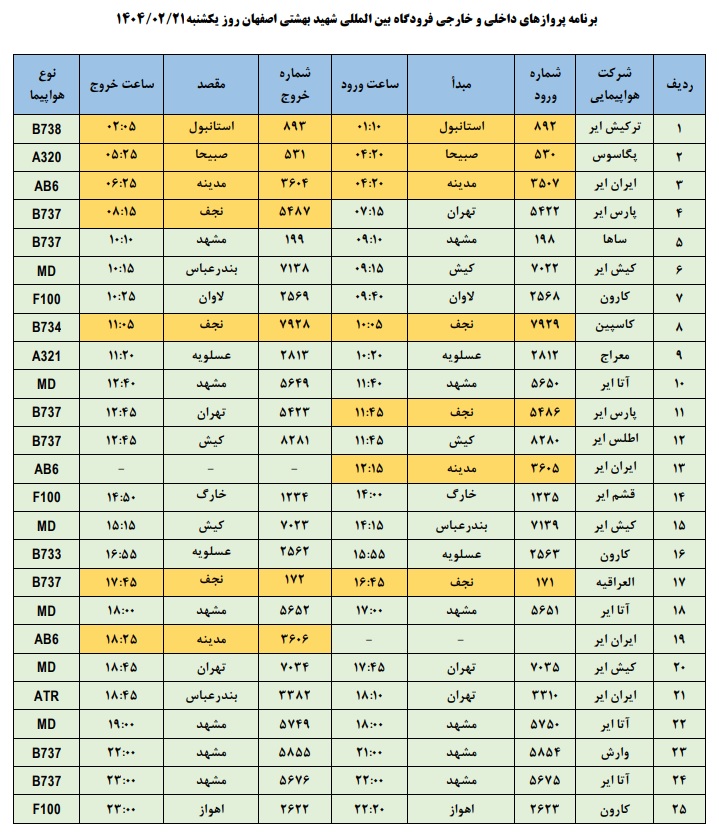 به گزارش نبض وطن، اطلاعات پروازهای داخلی و خارجی فرودگاه بینالمللی شهید بهشتی اصفهان امروز _یکشنبه بیست و یکم اردیبهشت ماه_ به شرح زیر است: