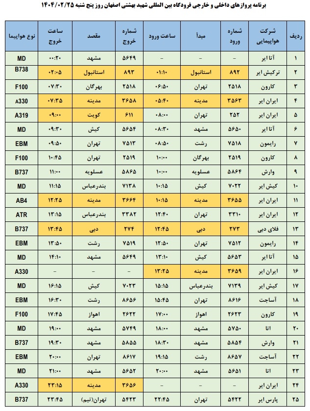 به گزارش نبض وطن، اطلاعات پروازهای داخلی و خارجی فرودگاه بینالمللی شهید بهشتی اصفهان امروز _پنجشنبه بیست و پنجم اردیبهشت ماه_ به شرح زیر است: