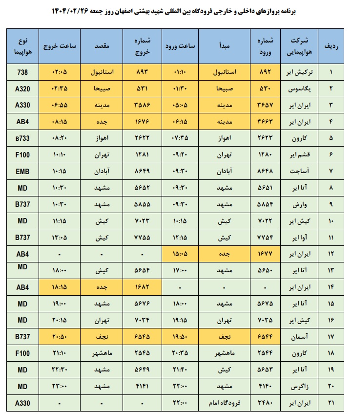 به گزارش نبض وطن، اطلاعات پروازهای داخلی و خارجی فرودگاه بینالمللی شهید بهشتی اصفهان امروز _جمعه بیست و ششم اردیبهشت ماه_ به شرح زیر است: