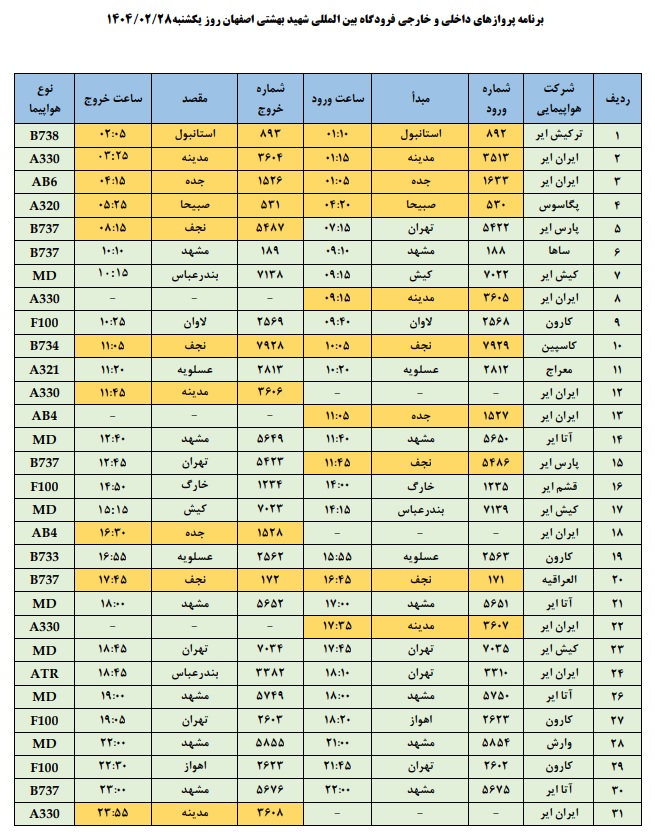 به گزارش نبض وطن، اطلاعات پروازهای داخلی و خارجی فرودگاه بینالمللی شهید بهشتی اصفهان امروز _یکشنبه بیست و هشتم اردیبهشت ماه_ به شرح زیر است: