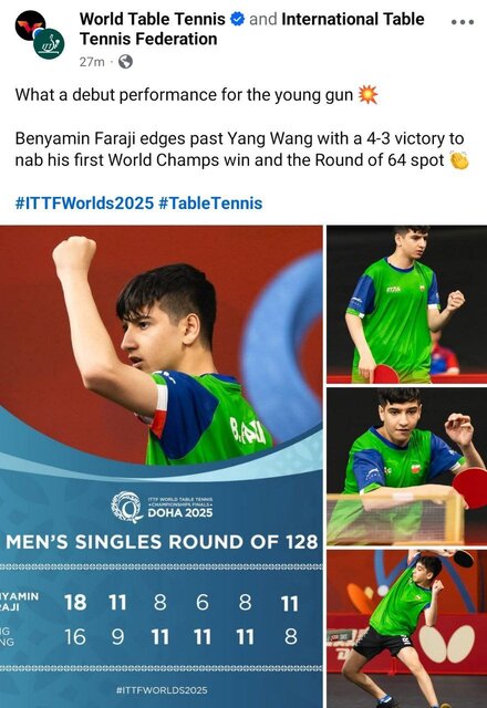 به گزارش نبض وطن، بنیامین فرجی ۱۵ ساله در جدول انفرادی مسابقات تنیس روی میز قهرمانی بزرگسالان جهان توانست حریف ۳۰ ساله خود از اسلواکی که چینی الاصل بود را شکست دهد.