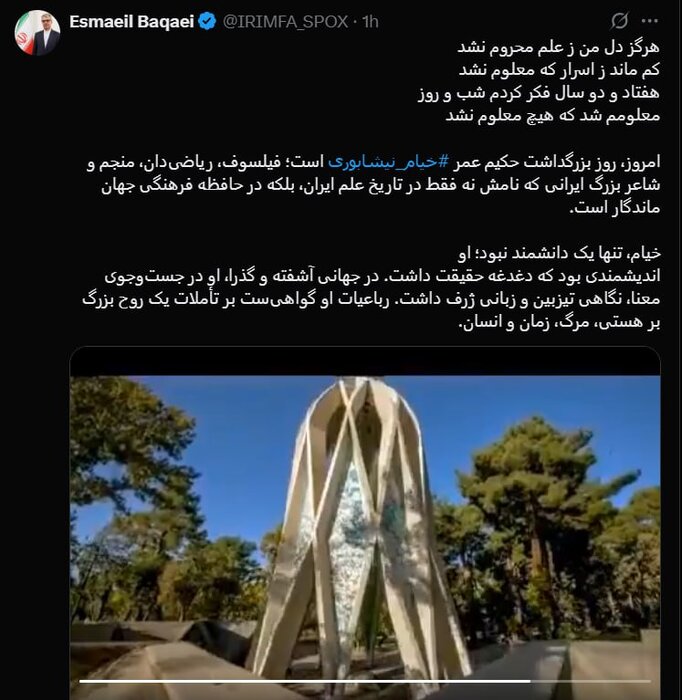به گزارش نبض وطن، متن پیام اسماعیل بقائی که یکشنبه شب ۲۸ اردیبهشت ۱۴۰۴ در شبکه ایکس منتشر شد، به شرح زیر است: