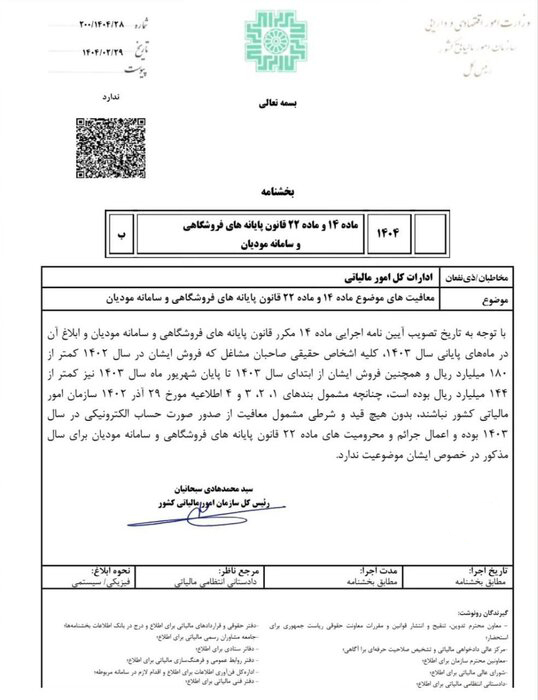 بر اساس این بخشنامه اصناف یا اشخاص حقیقی که فروش آنها در سال ۱۴۰۲ زیر ۱۸ میلیارد تومان و در نیمه نخست سال ۱۴۰۳ زیر ۱۴ میلیارد و ۴۰۰ میلیون تومان بوده است، از الزام به ثبت صورتحساب الکترونیکی در سامانه مؤدیان و پایانههای فروشگاهی بدون هیچ قید و شرطی معاف بوده و إعمال جرایم و محدودیتهای موضوع قانون پایانههای فروشگاهی برای این اشخاص، موضوعیتی ندارد.