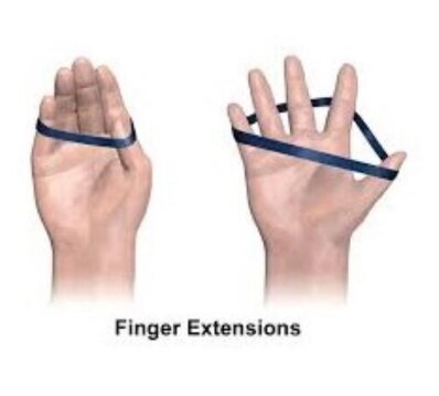 کشیدن انگشت به کمک کش: یکی دیگر از ورزشهایی که به باز شدن انگشتها کمک میکند این است که انگشتها را در حالتی که تحت فشار هستند، باز کنید. برای این کار اول انگشتها را به سمت داخل جمع کنید، طوری که هر کدام از انگشتها صاف باشند و فقط از بند اول خم شوند. بعد یک کش دور آنها بیندازید. حالا دستتان را در حالی که باید فشار کش را خنثی کند، باز و بسته کنید.