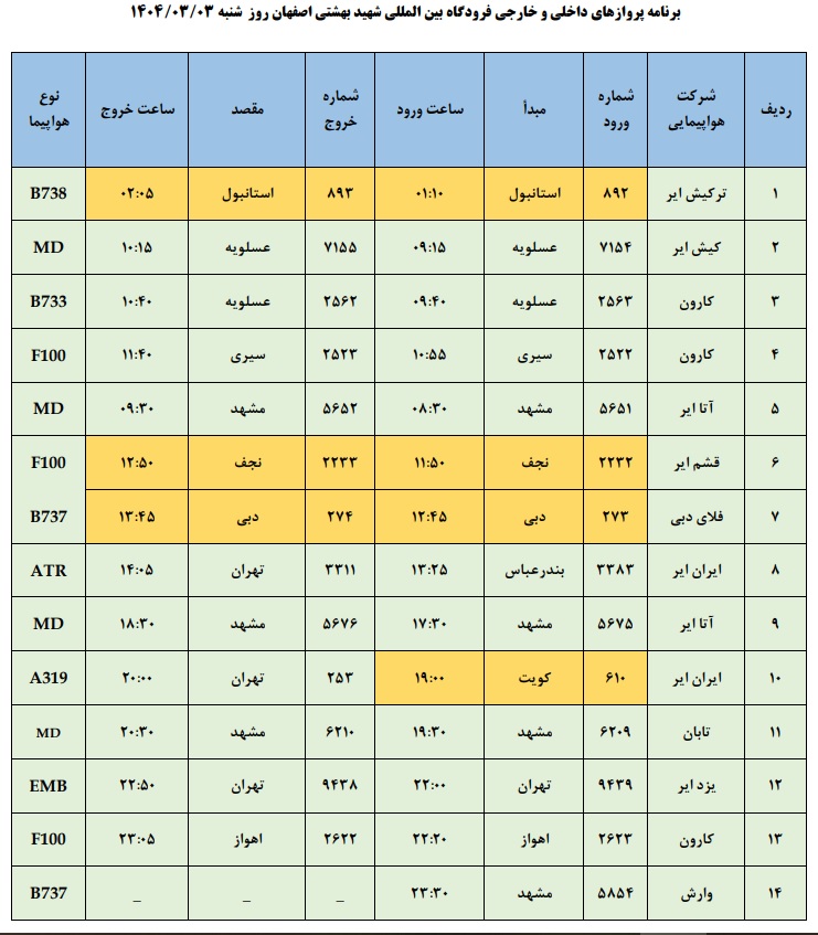 به گزارش نبض وطن، اطلاعات پروازهای داخلی و خارجی فرودگاه بینالمللی شهید بهشتی اصفهان امروز _شنبه سوم خرداد ماه_ به شرح زیر است: