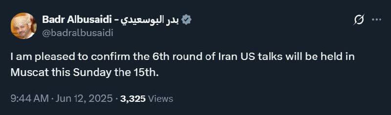 به گزارش نبض وطن، بدر البوسعیدی وزیر خارجه عمان امروز پنجشنبه در حساب ایکس خود نوشت: با کمال خرسندی تایید میکنم که ششمین دور مذاکرات ایران و آمریکا، یکشنبه هفته آتی(۲۵ خردادماه) در مسقط برگزار خواهد شد.
