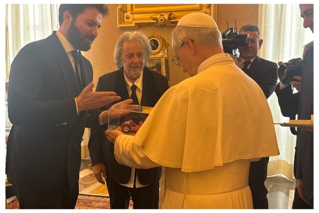 در عکسی که در ورایتی منتشر شده، یروولینو در حال تقدیم یک ماکت یادبود از خودروی مازراتی درون جعبهای شیشهای به پاپ دیده میشود، در حالی که پاچینو با احترام در کنار او ایستاده است.