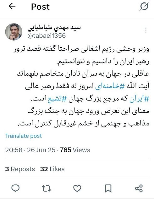 « وزیر وحشی رژیم اشغالی صراحتاً گفته قصد ترور رهبر ایران را داشتیم و نتوانستیم. عاقلی در جهان به سران نادان متخاصم بفهماند، آیتالله خامنهای امروز نه فقط رهبر عالی ایران که مرجع بزرگ جهان تشیع است. معنای این تعرض ورود جهان به جنگ بزرگ مذاهب و جهنمی از خشم غیرقابل کنترل است.»