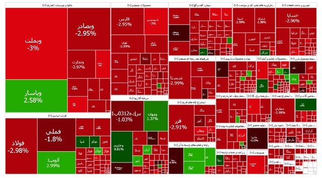 امروز نمادهای فارس، فملی و فولاد بیشترین تاثیر منفی را بر شاخص بورس داشتند. از نمادهای پرتراکنش نیز میتوان به وبملت، خساپا و وبصادر اشاره کرد.