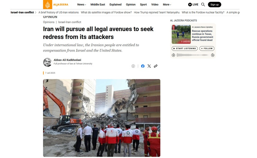 به گزارش نبض وطن، عباسعلی کدخدایی عضو حقوقدان و رئیس پژوهشکده شورای نگهبان با انتشار یادداشتی در وب سایت انگلیسی شبکه خبری الجزیره، به تبیین مبانی حقوقی تعهد غیر قابل انکار آمریکا و رژیم صهیونیستی برای جبران خسارات ناشی از رفتار متجاوزانه غیرقانونی اخیرشان علیه ایران پرداخت و تاکید کرد: ایران از همه ظرفیتهای حقوقی برای پیگیری و مطالبه خسارات ناشی از تجاوزات اخیر استفاده خواهد کرد.