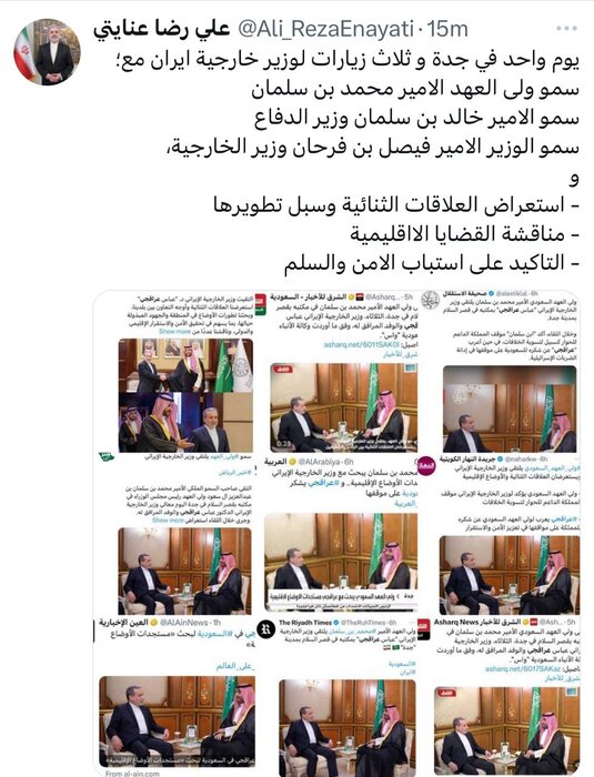به گزارش نبض وطن، «رضا عنایتی» سفیر جمهوری اسلامی ایران در عربستان سعودی در شبکه ایکس با اشاره به حضور یک روزه «سیدعباس عراقچی» در جده عربستان درباره این دیدارها نوشت: یک روز در جده و سه دیدار برای وزیر خارجه ایران با شاهزاده «محمد بن سلمان» ولیعهد سعودی، شاهزاده «خالد بن سلمان» وزیر دفاع و شاهزاده «فیصل بن فرحان» وزیر امور خارجه.