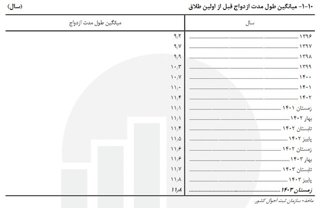 در بخش دیگری از این گزارش بر تعداد طلاق ثبت شده بر حسب طول مدت ازدواج نیز اشاره شده است.