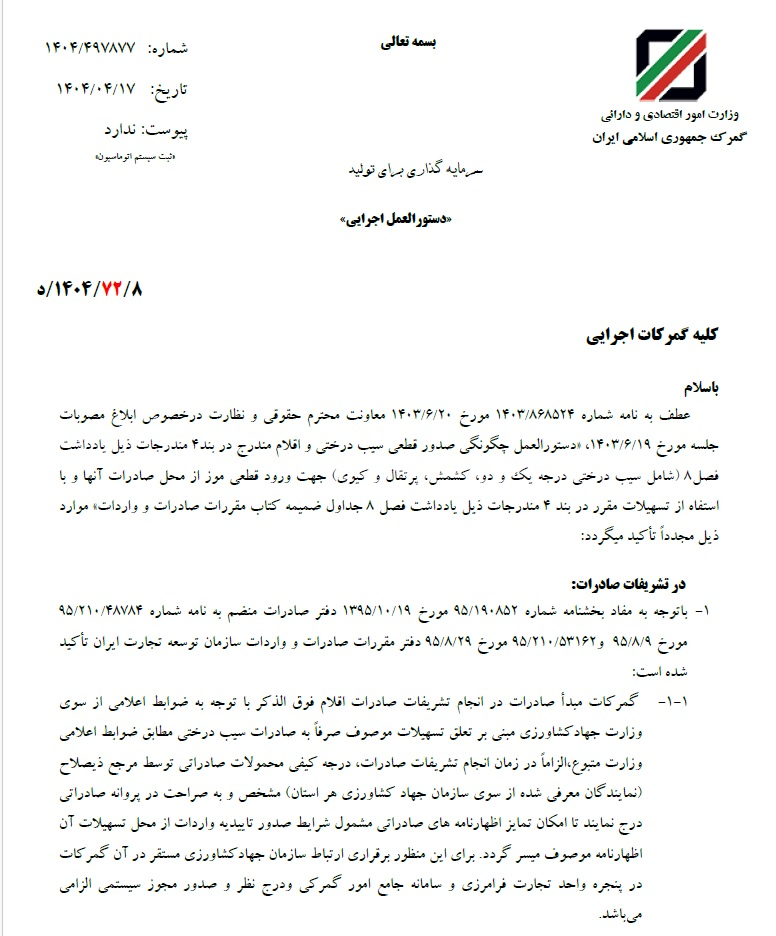 به گزارش نبض وطن، علیاکبر شامانی معاون امور گمرکی گمرک ایران طی بخشنامهای به گمرکات اجرایی دستورالعمل ورادت موز در برابر صادرات سیب درختی درجه یک و دو، کشمش، پرتقال و کیوی را ابلاغ کرد که بر اساس این دستورالعمل، گمرکات اجرایی مبدا صادرات باید به صراحت درجه کیفی محصول صادراتی را که به تأیید جهاد کشاورزی استان مربوطه رسیده باشد در اظهارنامه صادراتی درج کند تا امکان تمایز اظهارنامههای صادراتی مشمول شرایط صدور تاییدیه واردات از محل تسهیلات آن اظهارنامه موصوف میسر شود.