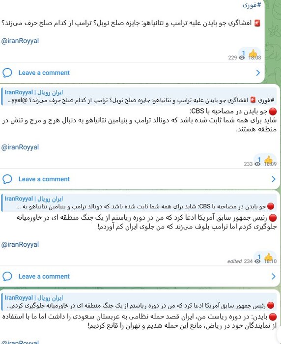 این کانال در ابتدای این مجموعه پست، ساعت ۱۸ و ۰۸ دقیقه ۲۶ تیر ماه نوشت: «افشاگری جو بایدن علیه ترامپ و نتانیاهو: جایزه صلح نوبل؟ ترامپ از کدام صلح حرف میزند؟» و یک دقیقه بعد پست کرد که «جو بایدن در مصاحبه با CBS: شاید برای همه شما ثابت شده باشد که دونالد ترامپ و بنیامین نتانیاهو به دنبال هرج و مرج و تنش در منطقه هستند.»