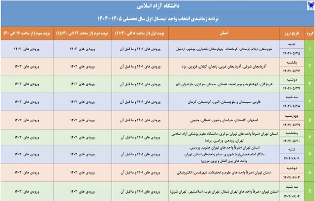 برنامه زمانبندی انتخاب واحد تکمیلی نیمسال اول سال تحصیلی ۱۴۰۵-۱۴۰۴ دانشگاه آزاد اسلامی به شرح جدول زیر است:
