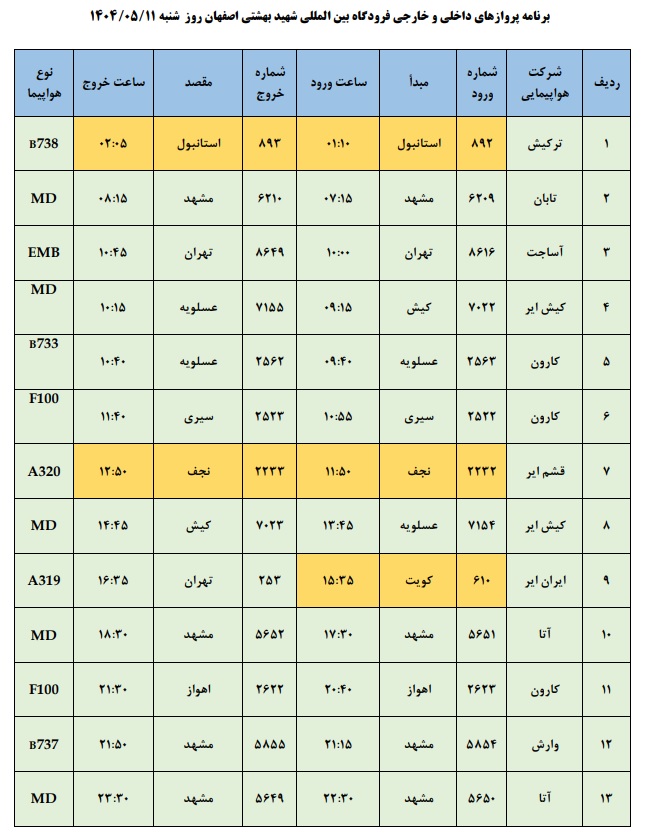 به گزارش نبض وطن، اطلاعات پروازهای داخلی و خارجی فرودگاه بینالمللی شهید بهشتی اصفهان امروز _چهارشنبه پانزدهم مرداد ماه_ به شرح زیر است: