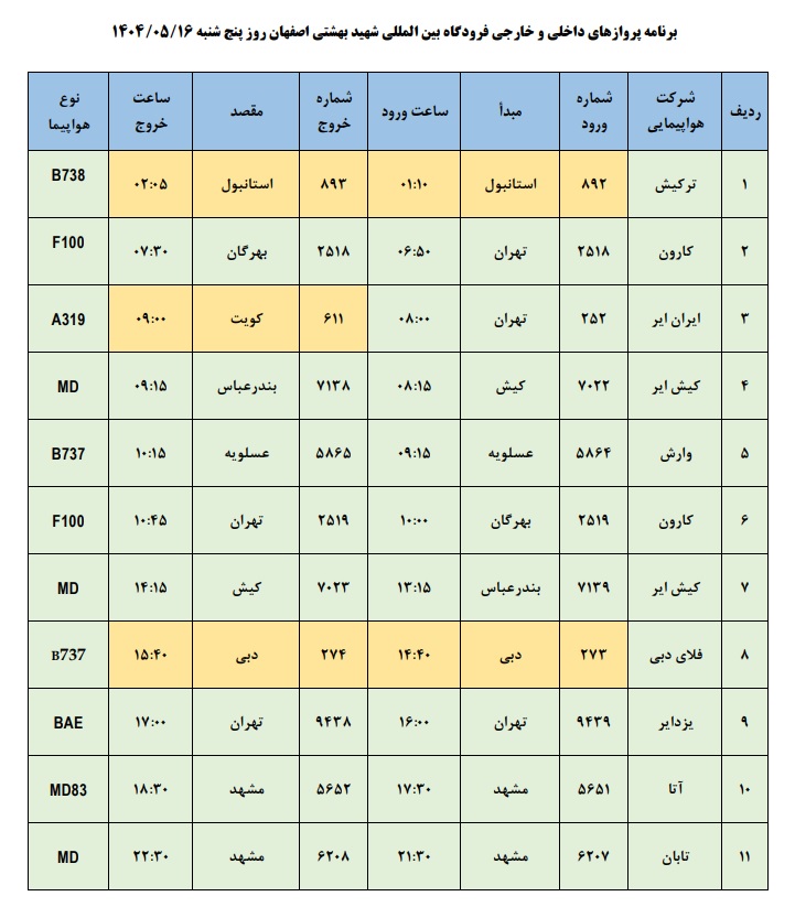 به گزارش نبض وطن، اطلاعات پروازهای داخلی و خارجی فرودگاه بینالمللی شهید بهشتی اصفهان امروز _پنجشنبه شانزدهم مرداد ماه_ به شرح زیر است: