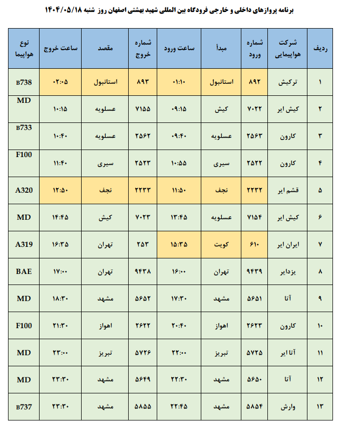 به گزارش نبض وطن، اطلاعات پروازهای داخلی و خارجی فرودگاه بینالمللی شهید بهشتی اصفهان امروز _شنبه هجدهم مرداد ماه_ به شرح زیر است: