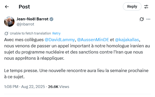 به گزارش نبض وطن، ژان نوئل بارو بعدازظهر امروز و پس از تماس تلفنی وی به همراه دیوید لمی و یوهان وادفول وزرای امور خارجه انگلیس و آلمان و کایا کالاس مسوول سیاست خارجی اتحادیه اروپا با سیدعباس عراقچی وزیر امور خارجه ایران نوشت: لحظاتی پیش تماس مهمی با همتای ایرانی خود درباره برنامه هستهای و تحریمهایی علیه ایران که در شرف اعمال مجدد آن هستیم، داشتیم.