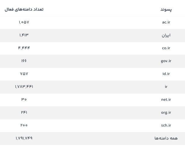 همچنین دامنههایی که بیشتر از ۱۰۰۰ مورد ثبتشده دارند، دامنه ایران با ۱۴۱۳ مورد و دامنه ac.ir با ۱۰۵۷ دامنه فعال هستند. البته دامنههای دیگری وجود دارند که کمتر از ۱۰۰۰ مورد به نام آنها ثبت شده است که می توان به دامنه id.ir با ۷۵۷مورد، دامنه org.ir با ۲۴۱مورد، دامنه sch.ir با ۲۰۰مورد و دامنه gov.ir با ۱۶۶مورد اشاره کرد.