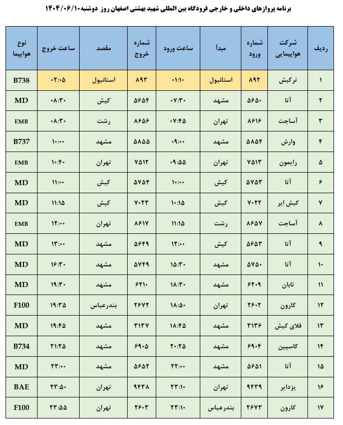 به گزارش نبض وطن، اطلاعات پروازهای داخلی و خارجی فرودگاه بینالمللی شهید بهشتی اصفهان امروز _دوشنبه دهم شهریور ماه_ به شرح زیر است: