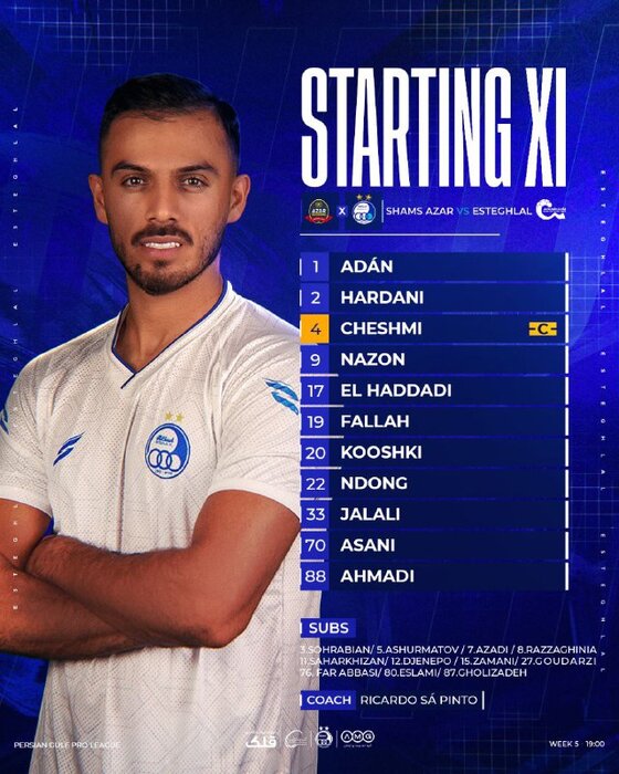 بر اساس تصمیم ریکاردو ساپینتو، استقلال در بازی امشب با ترکیب آنتونیو آدان، صالح حردانی، روزبه چشمی، داکنز نازون، منیر الحدادی، سامان فلاح، علیرضا کوشکی، دیدیه اندونگ، ابوالفضل جلالی، یاسر آسانی و مهران احمدی به میدان میرود.