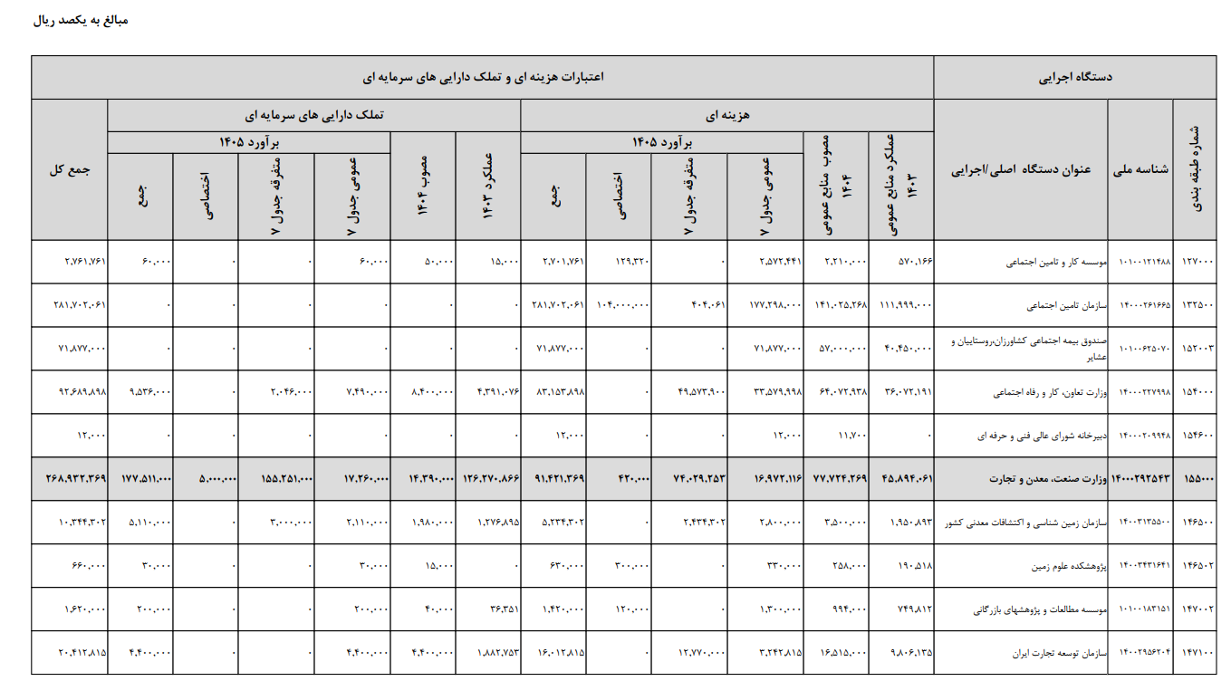 بودجه سازمان زمین شناسی و اکتشافات معدنی کشور، یک هزار و ۳۴ میلیارد تومان، سازمان توسعه تجارت ۲ هزار و ۴۱ میلیارد تومان، سازمان توسعه و نوسازی معادن و صنایع معدنی ایران – مادر تخصصی ۲ هزار و ۱۸ میلیارد دلار پیش بینی شده است.