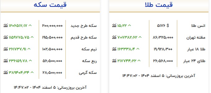 هر قطعه سکه طرح جدید با بیش از یک میلیون و ۲۰۰ هزار تومان افزایش، به ۲۰۰ میلیون تومان رسید و سکه طرح قدیم با رشد یک میلیون و ۱۵۹ هزار تومانی به ۱۹۵ میلیون و ۵۰۰ هزار تومان رسید.