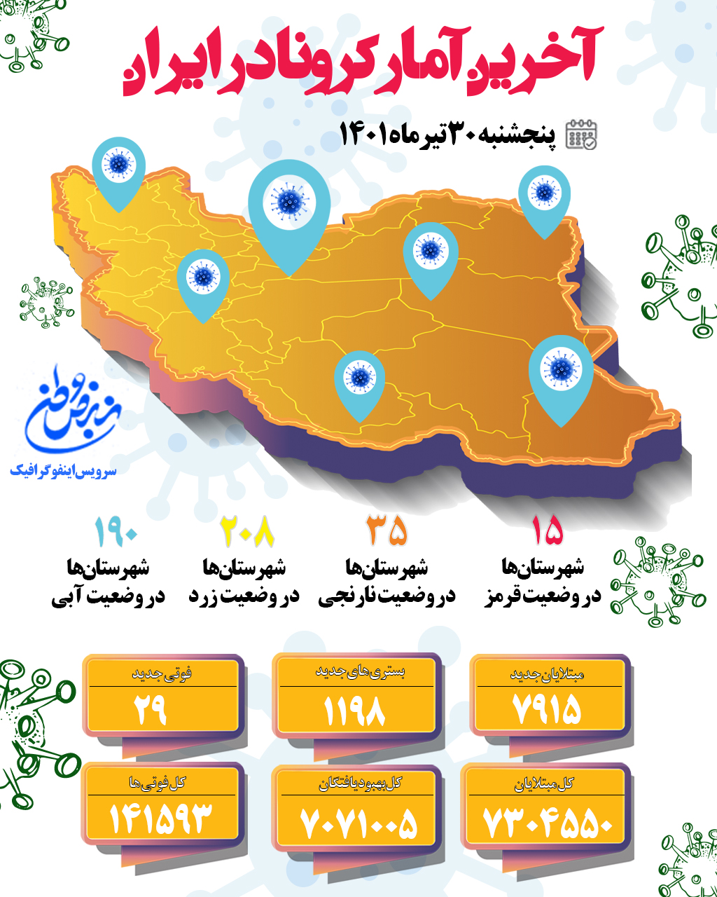 آمار کرونا امروز در ایران پنجشنبه ۳۰ تیر ۱۴۰۱
