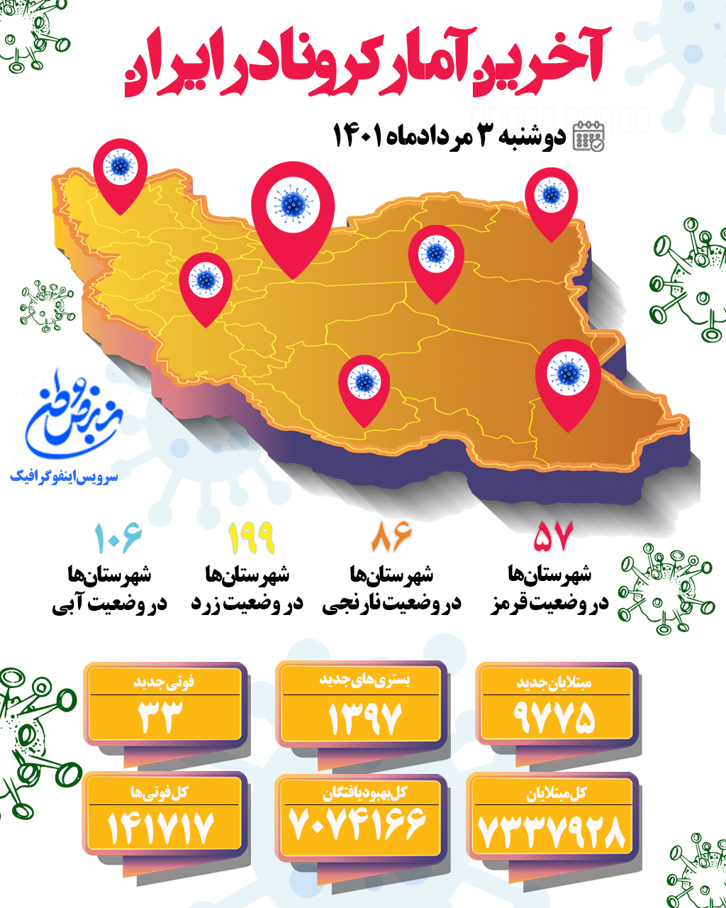 آمار کرونا امروز در ایران دوشنبه ۳ مردادماه ۱۴۰۱