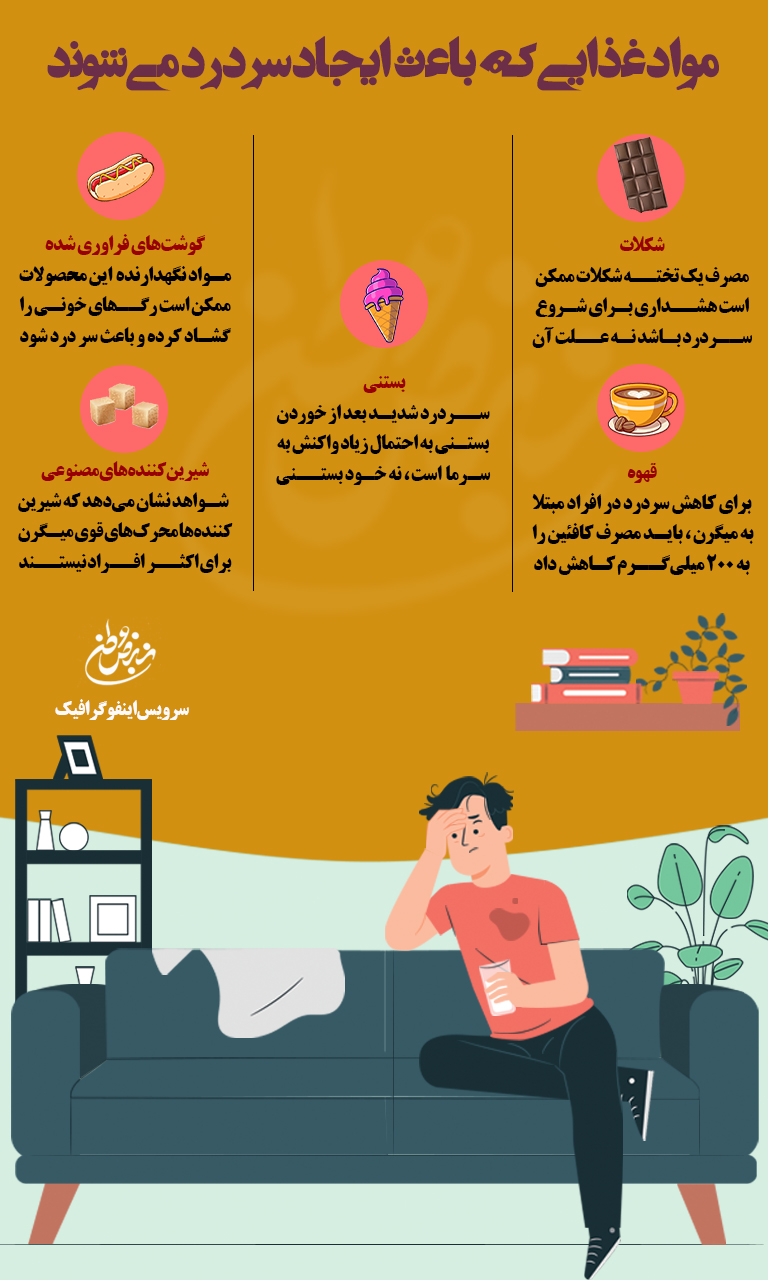 برخی از غذاها و نوشیدنیها ممکن است باعث سردرد یا حملات میگرنی شوند، بنابراین توجه به آنچه میخورید و مینوشید به شما در کشف علت سردرد یا محرکهای میگرنی کمک میکند. در این اینفوگرافیک به پنج محرک که باعث سر درد شده یا آن را تشدید میکنند، اشاره شده است.