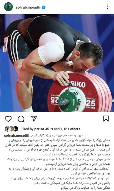 اینجانب سهراب مرادی از امروز اعلام میدارم با ورزش حرفهای و پهلوان پرور وزنهبرداری خداحافظی خواهم کرد.
