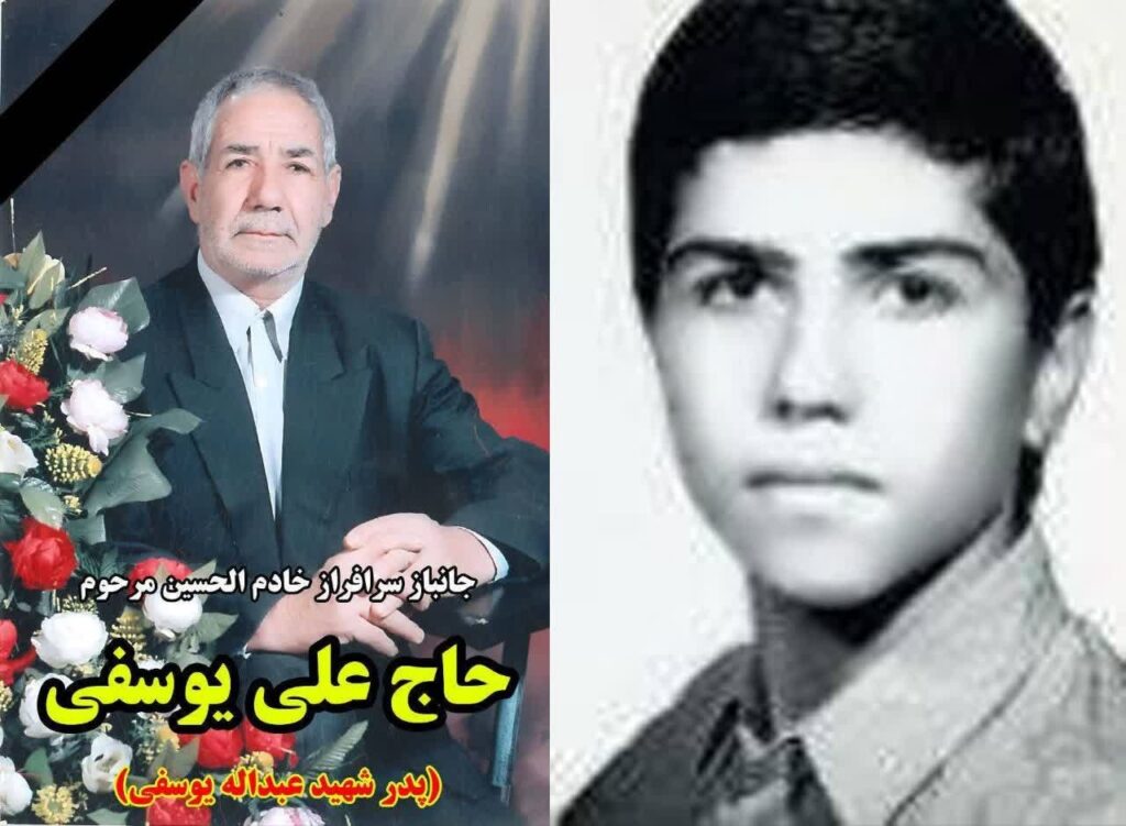 وی عنوان کرد: حاج علی یوسفی ریزی یکی از یادگاران دوران دفاع مقدس و پدر شهید عبدالله یوسفی که در سال ۱۳۶۱ در عملیات رمضان از ناحیه پا مجروح و به خیل عظیم جانبازان و ایثارگران پیوسته و در بسیاری از عملیاتها پس از مجروحیت به عنوان تدارکات حضور پیدا میکرد در سن ۸۰ سالگی دار فانی را وداع گفت و به فرزند شهیدش پیوست.