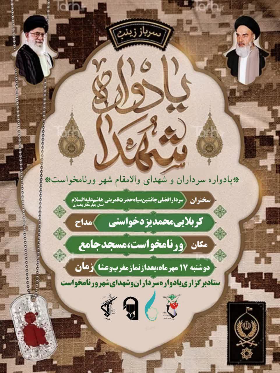 شهردار ورنامخواست خاطرنشان کرد: بر اساس برنامهریزیهای صورت گرفته یادواره سرداران و شهدای شهر ورنامخواست با حضور سردار افضلی جانشین سپاه حضرت قمر بنی هاشم استان چهار محال بختیاری روز دوشنبه هفدهم مهرماه بعد از نماز مغرب و عشاء در مسجد جامع این شهر برگزار خواهد شد.