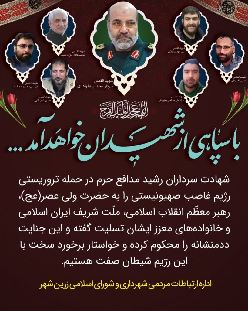 در نتیجه حمله تروریستی رژیم جعلی اسرائیل به ساختمان کنسولگری جمهوری اسلامی ایران در دمشق سردار محمد رضا زاهدی از میراث داران سردار دلها حاج قاسم سلیمانی و جمعی از فرماندهان و مستشاران ایرانی سپاه قدس به شهادت رسیدند؛ ضمن محکوم کردن این اقدام سخیف و غیرانسانی، وظیفه خود میدانم شهادت این عزیزان را به فرمانده معزز کل قوا حضرت آیتالله العظمی امام خامنهای (مدظلهالعالی)، رزمندگان جبهه مقاومت در منطقه، شهروندان ولایتمدار استان اصفهان و خطه طلایی ایران و خانواده محترم شهیدان والامقام این حادثه تروریستی تسلیت عرض مینمایم.