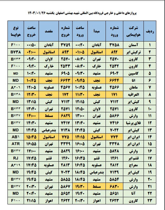 به گزارش نبض وطن، اطلاعات پروازهای داخلی و خارجی فرودگاه بینالمللی شهید بهشتی اصفهان امروز _یکشنبه بیستوششم فروردین_ به شرح زیر است: