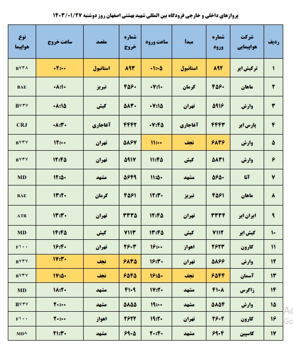 به گزارش نبض وطن، اطلاعات پروازهای داخلی و خارجی فرودگاه بینالمللی شهید بهشتی اصفهان امروز _دوشنبه بیستوهفتم فروردین_ به شرح زیر است: