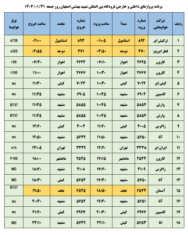 به گزارش نبض وطن، اطلاعات پروازهای داخلی و خارجی فرودگاه بینالمللی شهید بهشتی اصفهان امروز _جمعه سی و یکم فروردین_ به شرح زیر است: