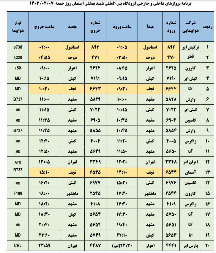 به گزارش نبض وطن، اطلاعات پروازهای داخلی و خارجی فرودگاه بینالمللی شهید بهشتی اصفهان امروز _جمعه هفشم اردیبهشت_ به شرح زیر است: