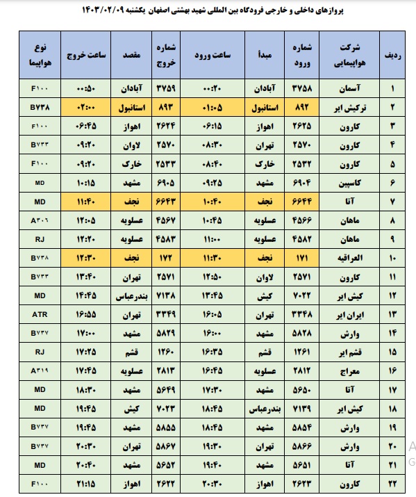به گزارش نبض وطن، اطلاعات پروازهای داخلی و خارجی فرودگاه بینالمللی شهید بهشتی اصفهان امروز _یکشنبه نهم اردیبهشت_ به شرح زیر است:
