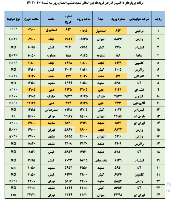 به گزارش نبض وطن، اطلاعات پروازهای داخلی و خارجی فرودگاه بینالمللی شهید بهشتی اصفهان امروز _سهشنبه یازدهم اردیبهشت_ به شرح زیر است: