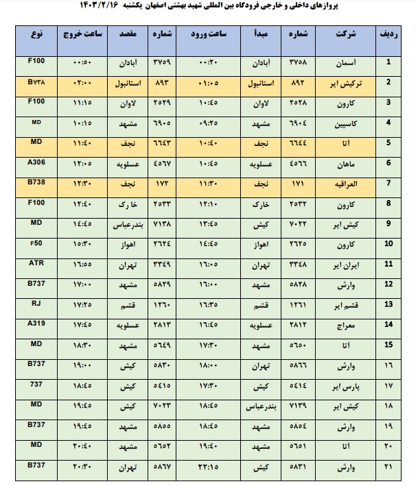 به گزارش نبض وطن، اطلاعات پروازهای داخلی و خارجی فرودگاه بینالمللی شهید بهشتی اصفهان امروز _یکشنبه شانزدهم اردیبهشت_ به شرح زیر است: