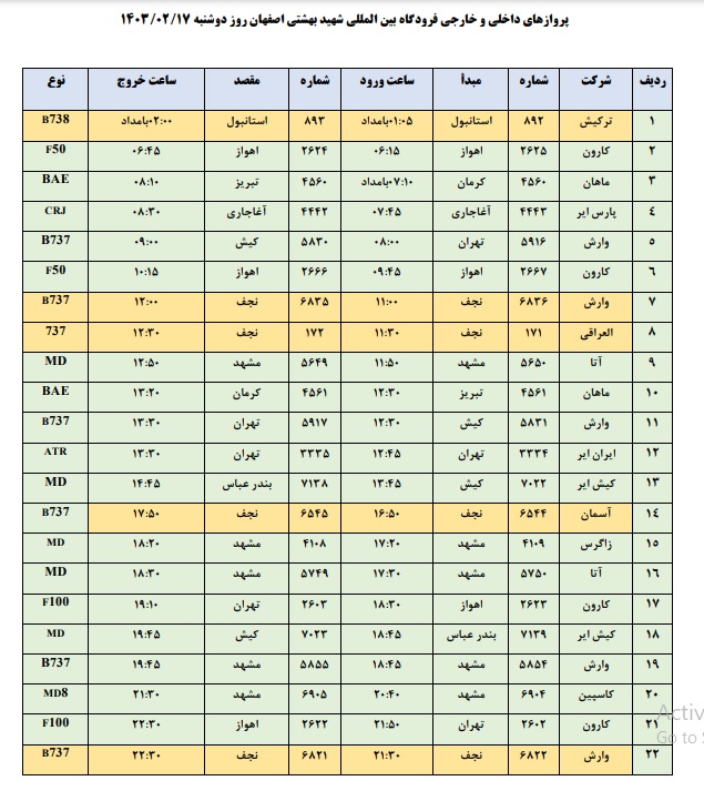 به گزارش نبض وطن، اطلاعات پروازهای داخلی و خارجی فرودگاه بینالمللی شهید بهشتی اصفهان امروز _دوشنبه هفدهم اردیبهشت_ به شرح زیر است: