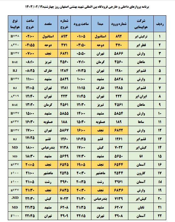 به گزارش نبض وطن، اطلاعات پروازهای داخلی و خارجی فرودگاه بینالمللی شهید بهشتی اصفهان امروز _چهارشنبه نوزدهم اردیبهشت_ به شرح زیر است: