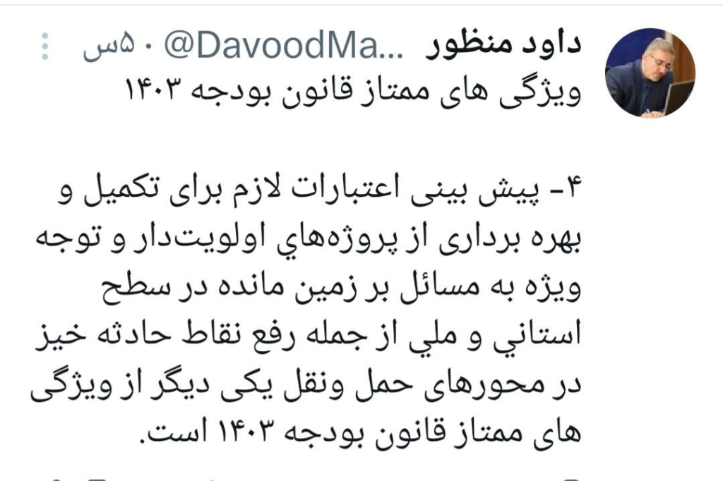 به گزارش نبض وطن، داود منظور در صفحه خود در فضای مجازی با اشاره به ویژگیهای ممتاز قانون بودجه ۱۴۰۳، نوشت: پیشبینی اعتبارات لازم برای تکمیل و بهرهبرداری از پروژههای اولویتدار و توجه ویژه به مسائل بر زمین مانده در سطح استانی و ملی از جمله رفع نقاط حادثهخیز در محورهای حمل و نقل یکی دیگر از ویژگیهای ممتاز قانون بودجه ۱۴۰۳ است.