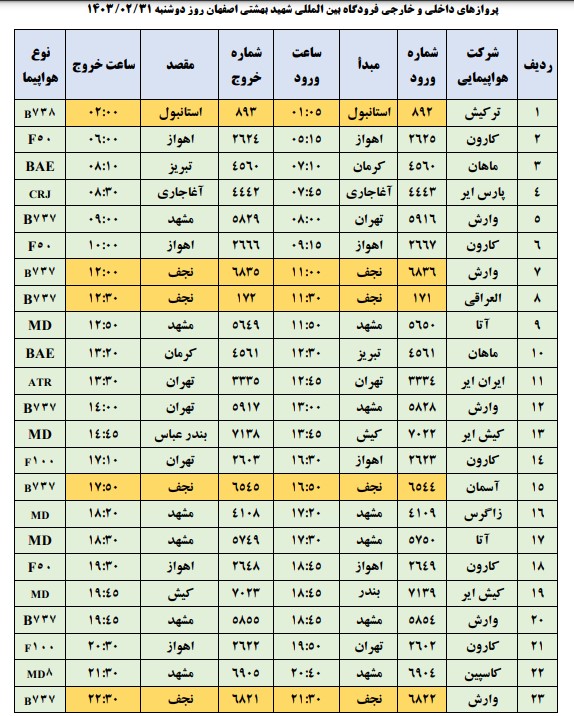 به گزارش نبض وطن، اطلاعات پروازهای داخلی و خارجی فرودگاه بینالمللی شهید بهشتی اصفهان امروز _دوشنبه سیو یکم اردیبهشت__ به شرح زیر است: