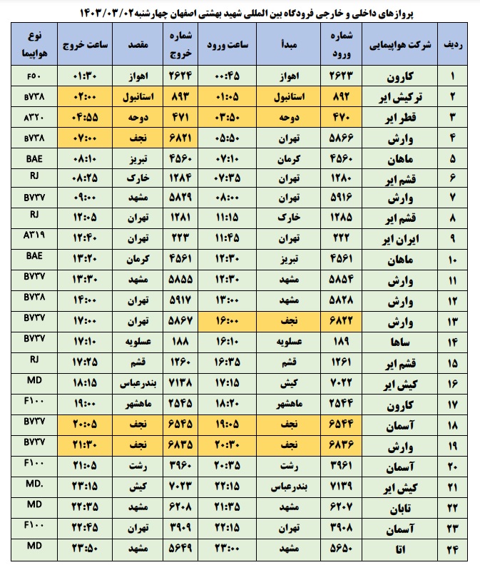 به گزارش نبض وطن، اطلاعات پروازهای داخلی و خارجی فرودگاه بینالمللی شهید بهشتی اصفهان امروز _چهارشنبه دوم خرداد__ به شرح زیر است: